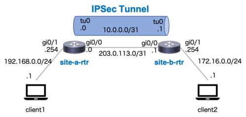 IKEv1 で認証に証明書を使用する設定を検証しました。 環境 検証環境 site-a-rtr と site-b-rtr の間で Static VTI を利用して IPSec Tunnel を確立させます。IPSec SA を確立するための IKEv1 で証明書認証を設定しました。 site-a-rtr を例に設定を解説し…